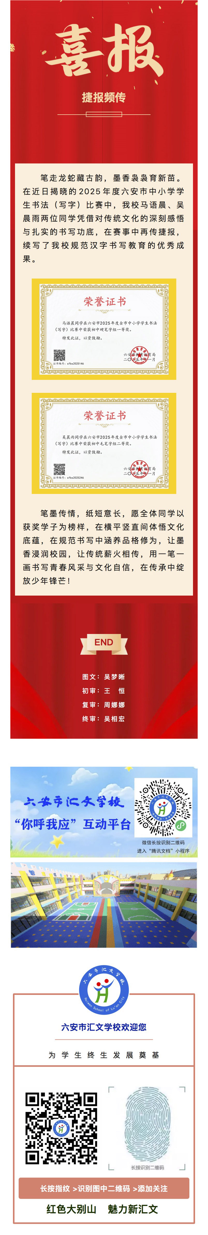 【汇文·德育】捷报频传!我校学子在2025年度六安市中小学学生书法(写字)比赛中再获佳绩!